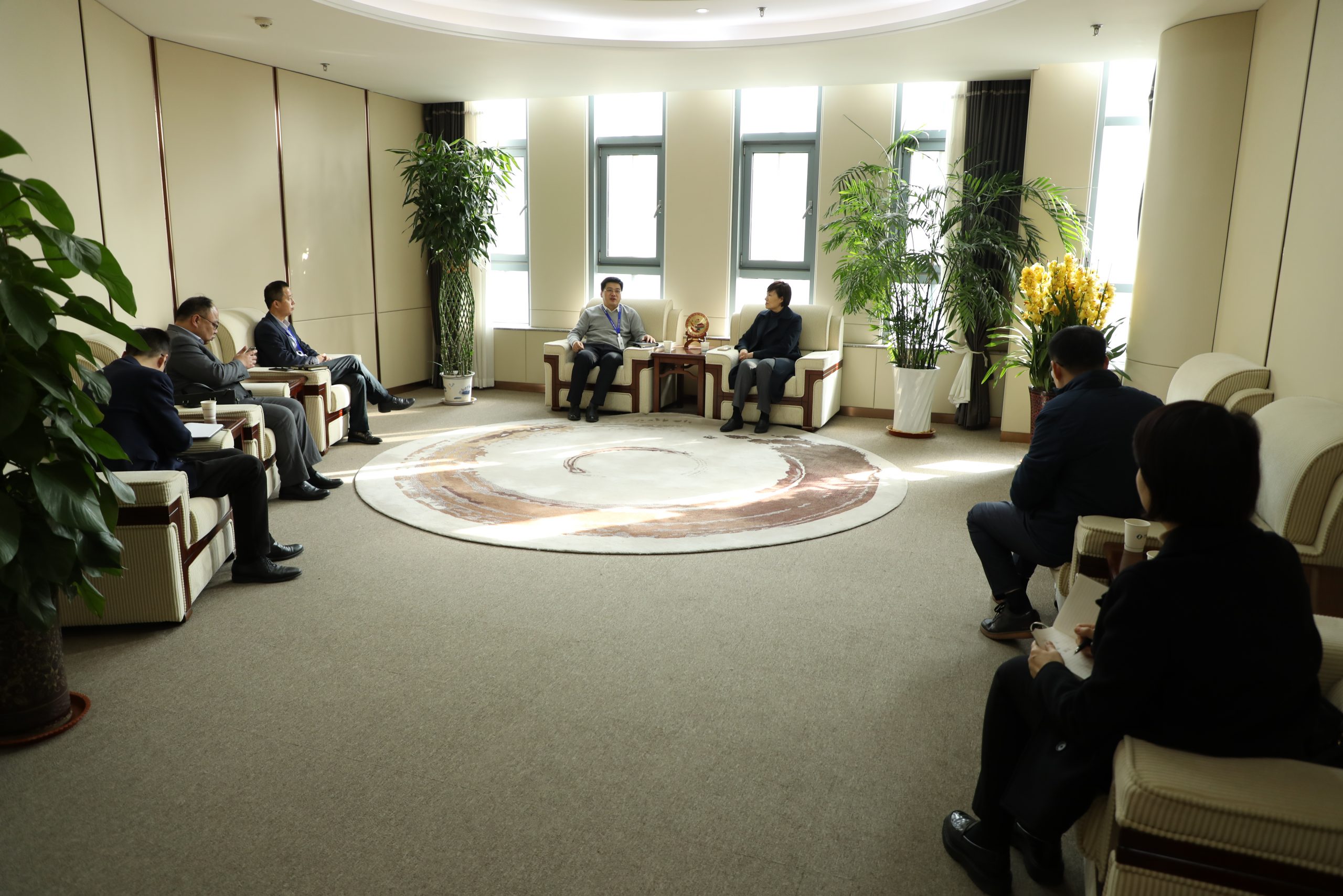 2月16日,日照銀行濟南分行黨委書記、行長潘青一行到訪濟南高新,集團黨委委員、副總經理、濟南高新董事長王成東接待了來訪客人一行。