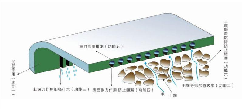 本產品采用PVC高密度聚合材料,具有較好的韌性,埋于土中可以起到拉結土壤的作用(功能一);且一反傳統(tǒng)改采用密集溝槽,內大外小的設計,且埋設時溝槽面向下,而使水流由下往上倒吸進入毛細導水管(功能二);如此一來土壤顆粒因重力自然沉淀不致隨同水流進入毛細導水管內,同時也不會在進水槽溝附近產生淤積現(xiàn)象(功能三);但是內部溝槽既能進水,同時也造成漏水之后果,此時毛細防排水板則利用表面張力使水在溝槽上產生封閉效果不回漏(功能四);當水進入時,毛細現(xiàn)象會自然而然對土壤中的水分產生抽吸的效果,直到灌滿并以重力流向外排放(功能五);當水流到達出口將因落差產生虹吸作用,進一步對土壤內部產生負壓,大幅增加吸排水效果(功能六)。